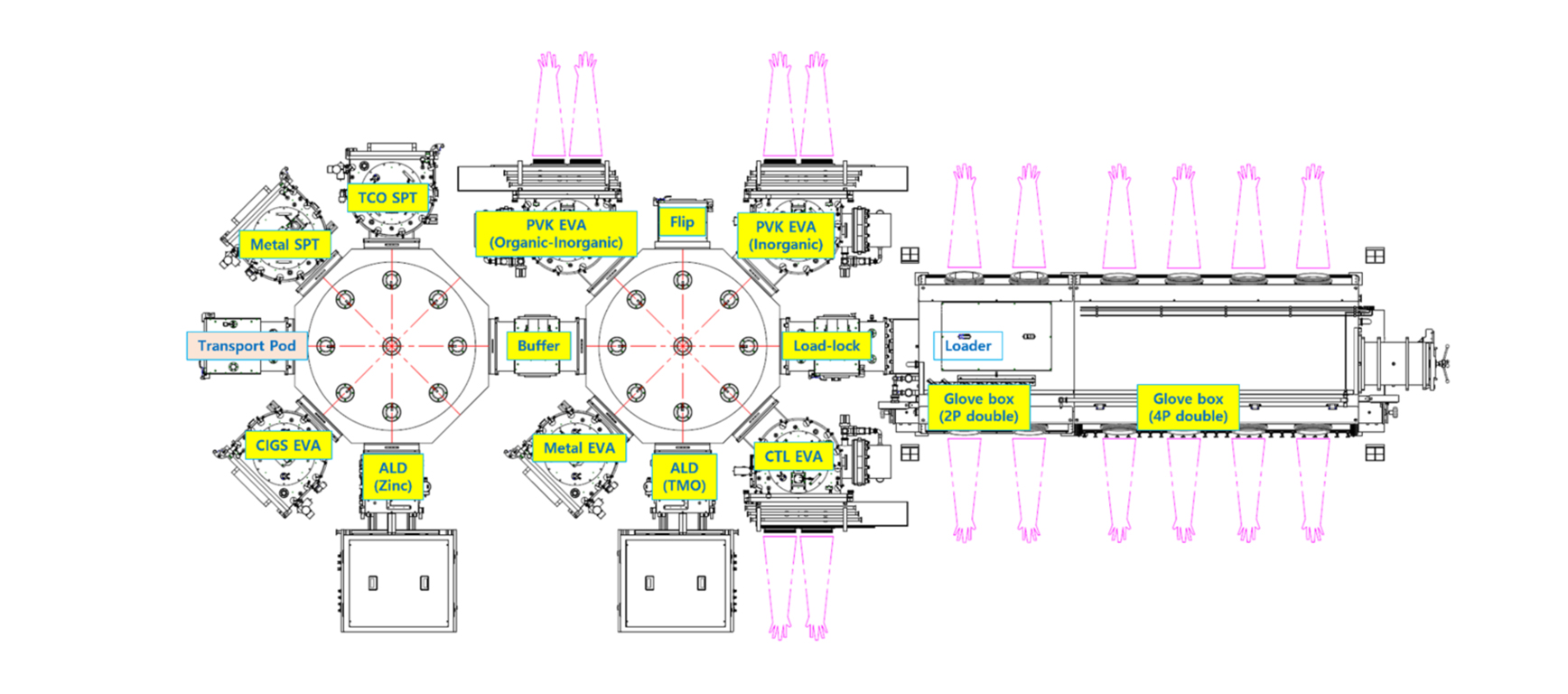 파장을 흡수할 수 있는 페로브스카이트 태양광 클러스터 장비 와, 800 ~ 1100nm 파장을 흡수 할 있는 CIGS 클러스터 장비로 구성 되어있습니다.